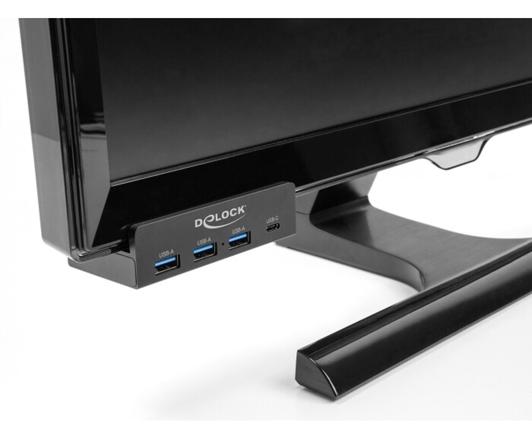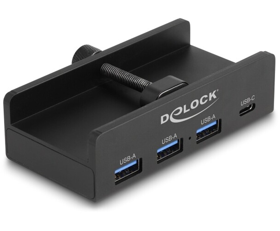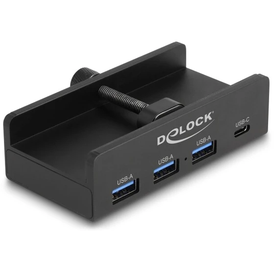 Hub USB marki Delock umożliwia rozbudowę komputera o trzy porty USB-A i jeden port USB-C poprzez połączenie z interfejsem USB-A. Dzięki konstrukcji z możliwością montażu na monitorze lub biurku za pomocą śruby blokującej zapewnia wygodne i stałe umiejscowienie, co ułatwia szybkie podłączanie urządzeń jedną ręką. Dodatkowe gniazdo USB-C może służyć do zasilania podłączonych urządzeń, jeśli moc z portu hosta jest niewystarczająca. Solidna obudowa wykonana z aluminium i tworzywa gwarantuje trwałość oraz elegancki wygląd.