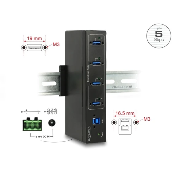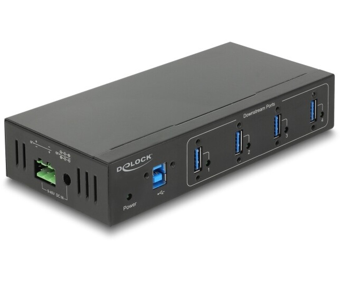 Przemysłowy hub USB marki Delock umożliwia rozszerzenie komputera o cztery porty USB 3.0 Typu-A z obsługą szybkiego ładowania urządzeń zgodnie ze specyfikacją BC1.2, co pozwala na efektywniejsze ładowanie smartfonów i innych urządzeń mobilnych. Może być zasilany bezpośrednio z magistrali USB lub z zewnętrznego źródła zasilania o napięciu od 9V do 40 V. Solidna metalowa obudowa, gniazda z mocowaniem na śruby oraz możliwość montażu na ścianie czynią urządzenie idealnym do zastosowań przemysłowych, wymagających stabilnej i bezpiecznej pracy. Ochrona ESD do 15 kV zapewnia wysoką odporność na wyładowania elektrostatyczne.