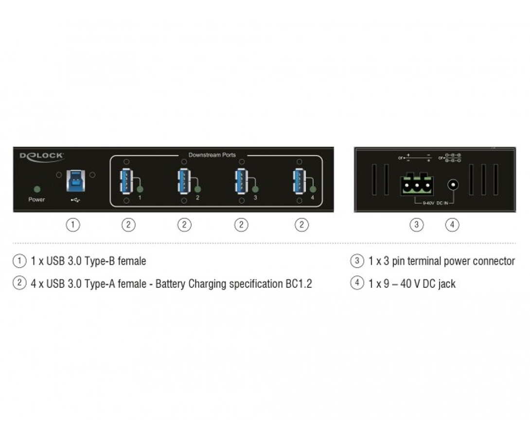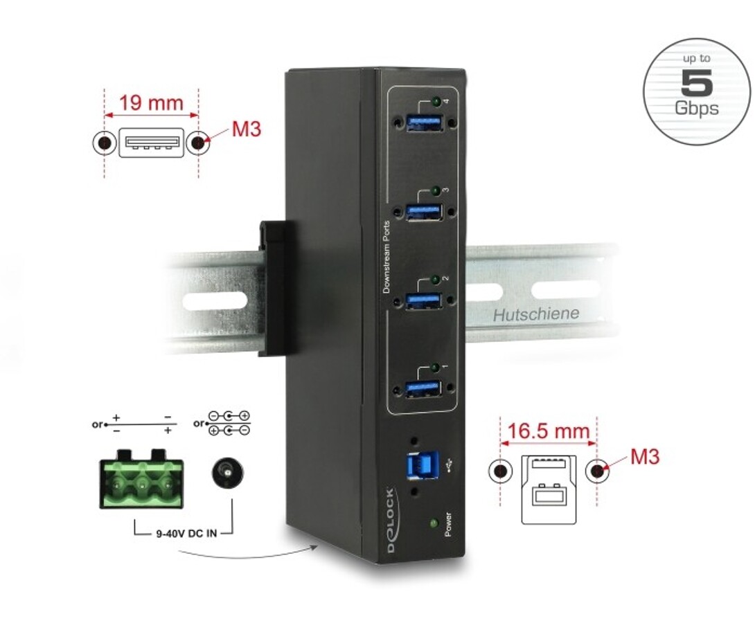 - Złącza: 1 x USB 3.0 typu B żeński, 4x USB 3.0 typu A żeńskie (BC1.2), 1 x gniazdo zasilania 9–40V DC, 1 x 3-pinowe złącze zasilania