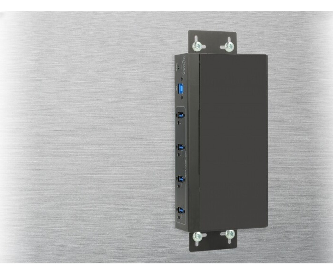 Hub USB marki Delock w metalowej obudowie oferuje cztery porty USB 5 Gbps Typu-A i umożliwia stabilny montaż na biurku lub monitorze dzięki śrubie mocującej. Zapewnia szybki transfer danych, trwałość konstrukcji i wygodny dostęp do portów. Idealny do biura, warsztatu lub stanowisk przemysłowych.