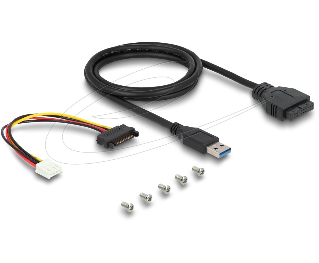 - Przewody połączeniowe: 1 x USB typu A męski do 19-pin USB żeński, długość ok. 74 cm (bez złączy); 1 x kabel zasilania 4-pin żeński do SATA 15-pin męski, długość ok. 17 cm (bez złączy)