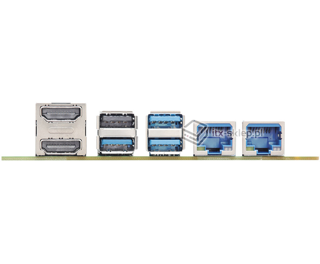 Płyta została wyposażona w szeroki zestaw portów we/wy oraz złączy wewnętrznych, co pozwala na elastyczne integracje w rozmaitych systemach i maszynach.
